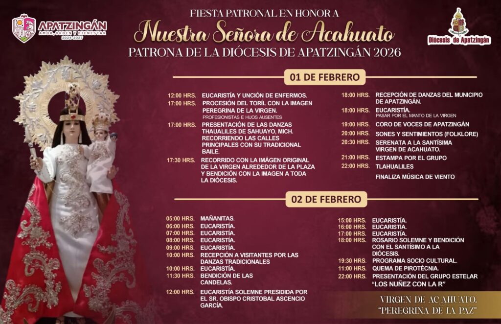 El Gobierno Municipal y la Diócesis de Apatzingán invitan a la ciudadanía a participar en la Fiesta Patronal en Honor a Nuestra Señora de Acahuato 2026 📅 1 y 2 de febreroUn programa lleno de fe, tradición y unión. AmorOrdenBienestar #FiestaPatronal #Acahuato